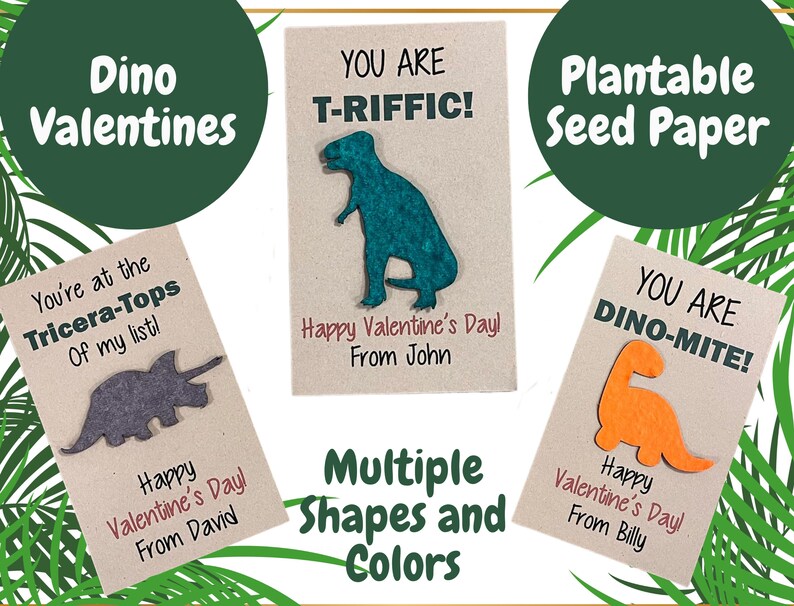 These super fun Valentines feature happy dinosaurs made of seed paper. Plant them and watch ’em grow!
