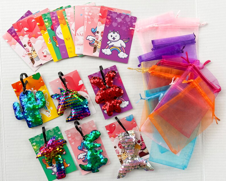 If you are looking for something sweet, simple, and adorable, then these Valentines are it. This set comes with sequin animal creature keychains and coordinating valentine cards.