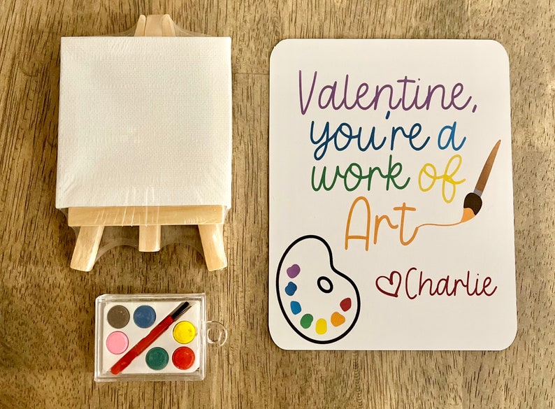These Valentines are awesome. Your child’s inner artist will be so excited to share these personalized painting kits from Moms Scraps on Etsy! Each kit includes a personalized valentine, a mini easel, and a mini watercolor set. 🎨